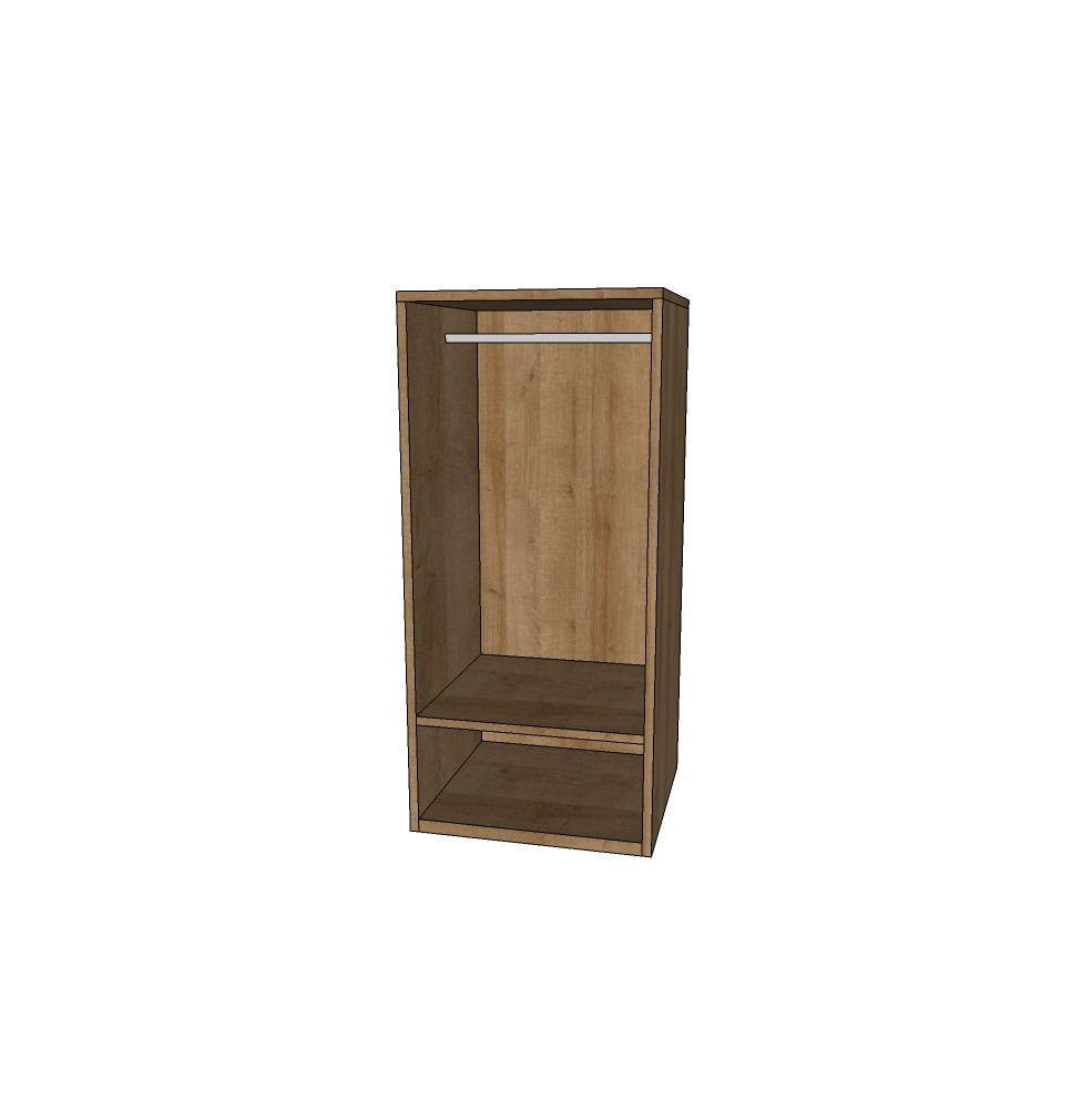 Descripción del productoEl modulo de armario construido en tablero de 16 mm., en color elegido por usted, se compone de: 2 costados, suelo, techo, 1 balda, 1 barra de colgar,  según medida y trasera, con todo el herraje necesario para su montaje.